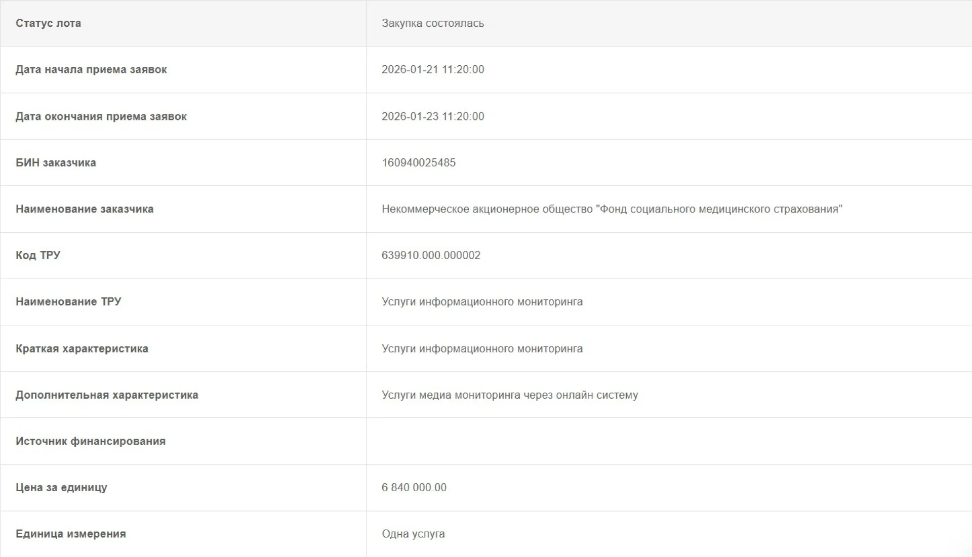 В начале 2026 года Фонд социального медицинского страхования (ФСМС) объявил тендер на услуги медиамониторинга, выделив на эти цели 6 840 000 тенге. Победителем тендера стала компания Futurum Agency, которая будет осуществлять мониторинг публикаций в СМИ и социальных сетях, связанных с деятельностью Фонда, в режиме 24/7.